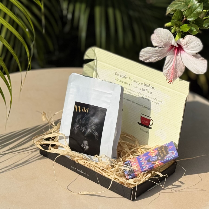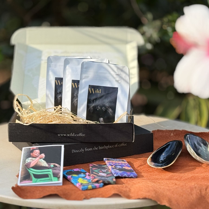 In addition to various types of our award-winning coffee, the boxes contain locally produced chocolate and/or unique handmade bowls made from Ankole cow horns. Each box also includes a traditional Ugandan coffee gift – beans wrapped in banana fiber. Finally, a card with the farmer's story and greetings, as well as the story of Wild, is included.