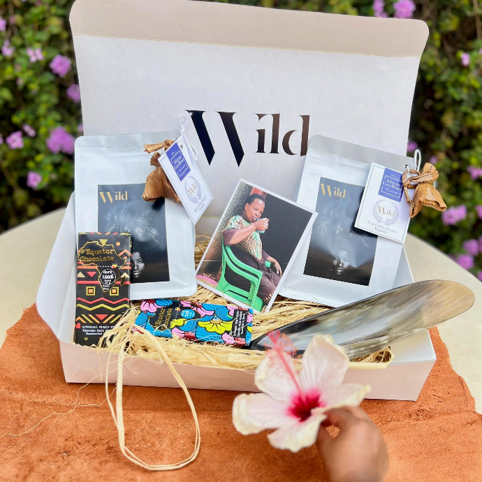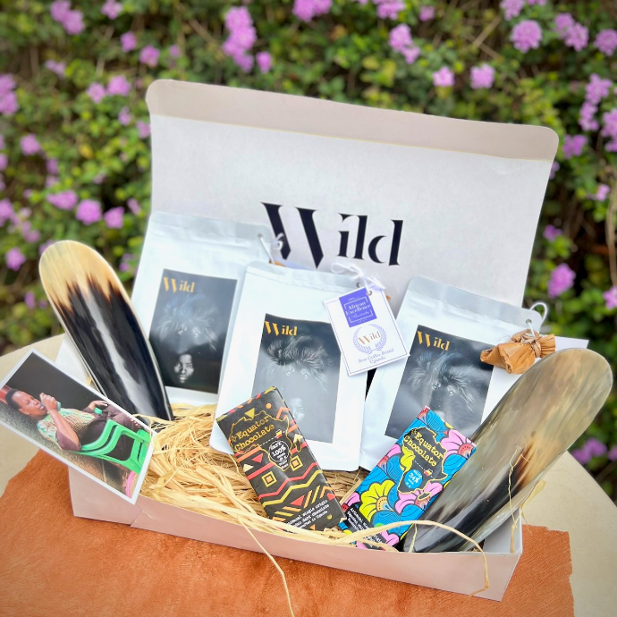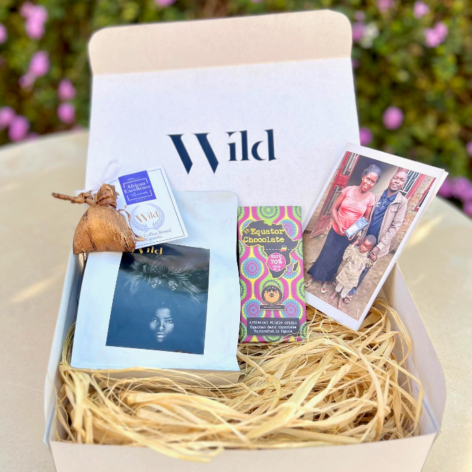 In addition to various types of our award-winning coffee, the boxes contain locally produced chocolate and/or unique handmade bowls made from Ankole cow horns. Each box also includes a traditional Ugandan coffee gift – beans wrapped in banana fiber. Finally, a card with the farmer's story and greetings, as well as the story of Wild, is included.